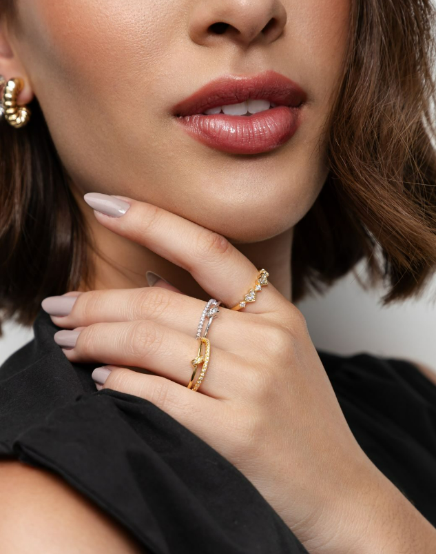 Use vários anéis delicados em uma mão só para criar um visual leve e estiloso. Dica: misture modelos lisos com peças cravejadas para um efeito elegante.