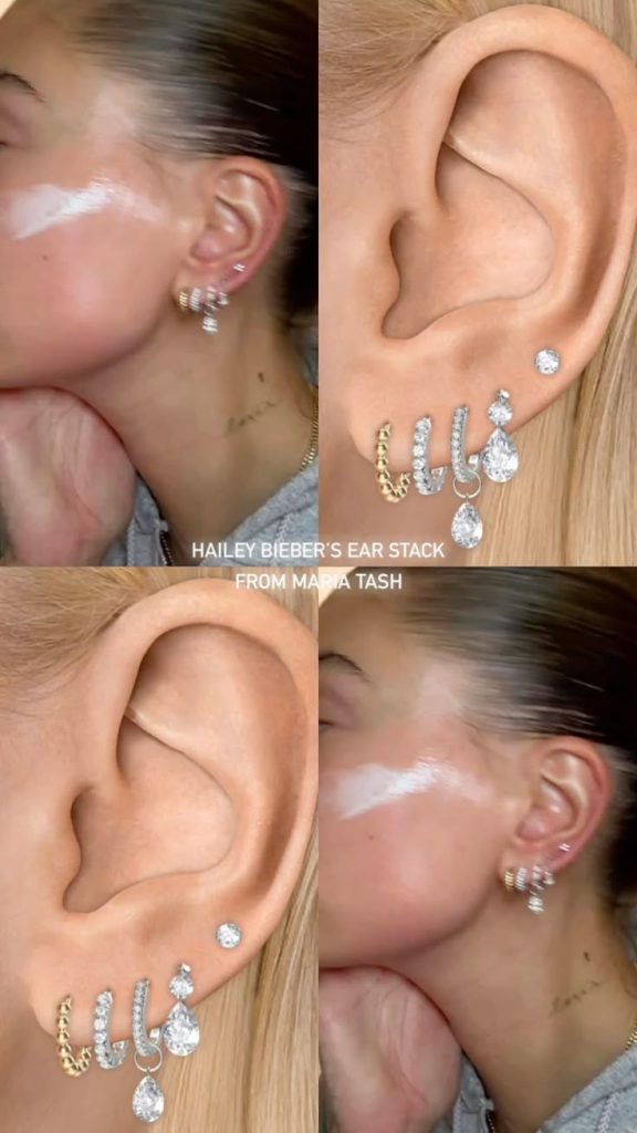 A composição de brincos pequenos ao longo da orelha — conhecida como ear stacking — é uma paixão da Hailey. Ela aposta em argolinhas, studs com zircônias e mini piercings falsos para construir seu visual cool.
