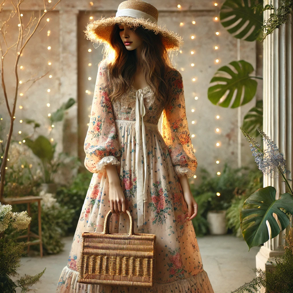 - A estética cottagecore, com vestidos de algodão, estampas florais e babados, ganhou força, trazendo um ar bucólico e romântico.